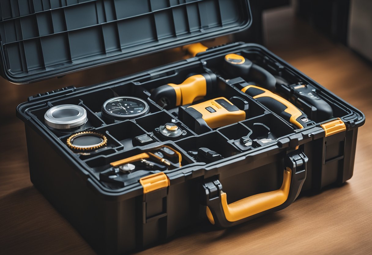 A toolbox with various tools and a GPS tracker attached to each one